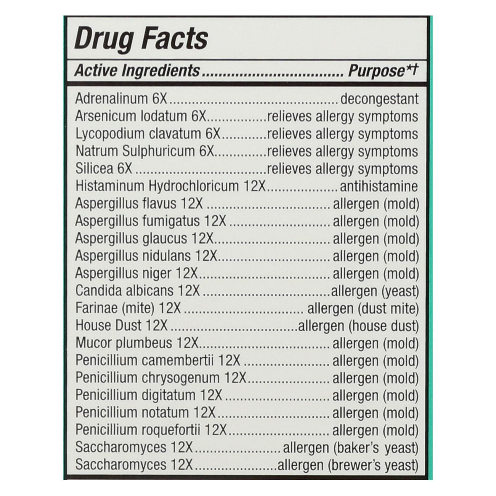 ingredients : drug facts adrenalinum 6x purpose*† decongestant arsenicum iodatum 6x purpose*† relieves allergy symptoms lycopodium clavatum 6x purpose*† relieves allergy symptoms natrum sulphuricum 6x purpose*† relieves allergy symptoms sillcea 6x purpose*† relieves allergy symptoms histaminum hydrochloricum 12x purpose*† antihistamine aspergillus flavus 12x purpose*† allergen;mold;aspergillus fumigatus 12x purpose*† allergen;aspergillus glaucus 12x purpose*† allergen;aspergillus nidulans 12x purpose*† aller